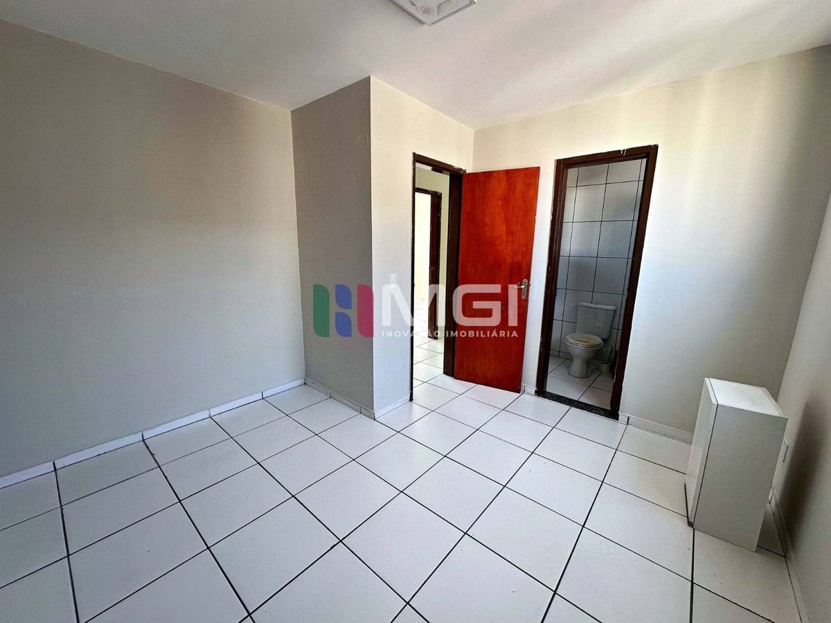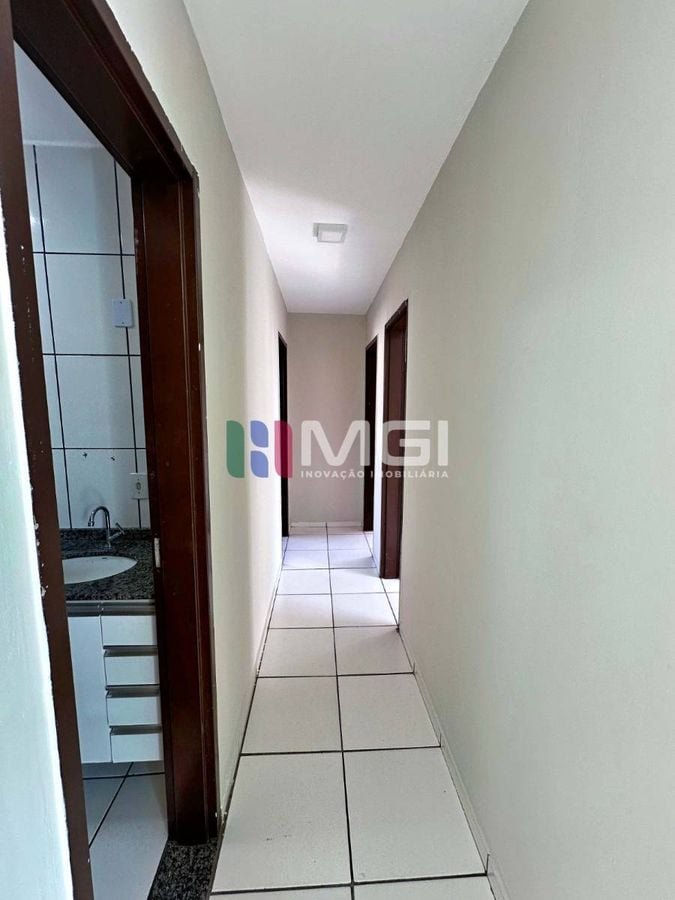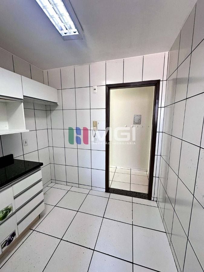 Conta com 3 quartos, sendo 1 suíte, piso cerâmico branco, cozinha com armários planejados e banheiros com box e armários.