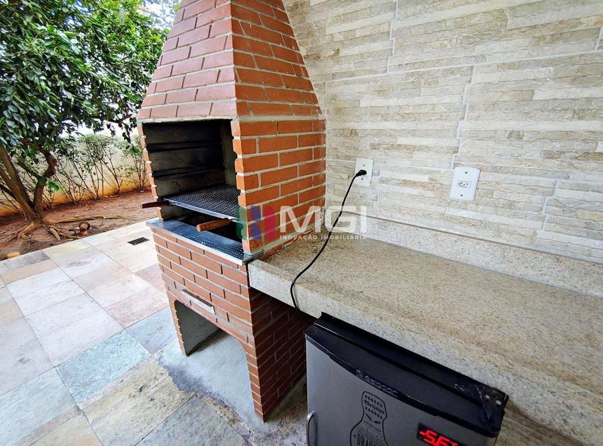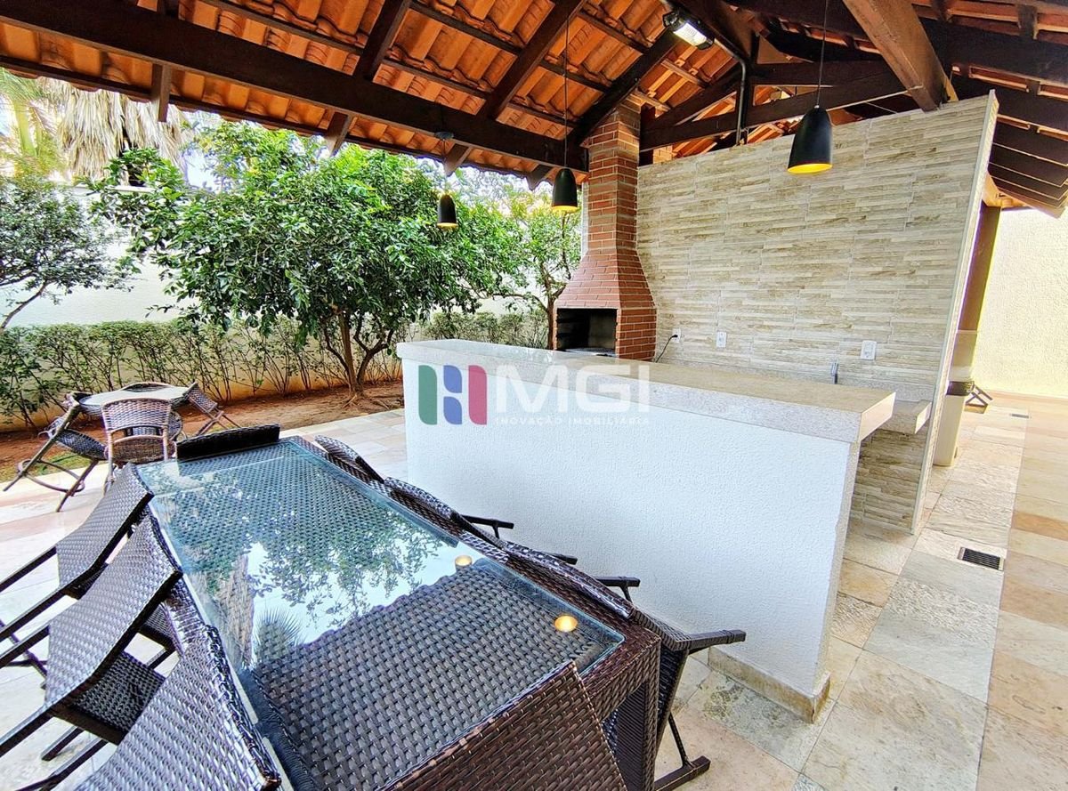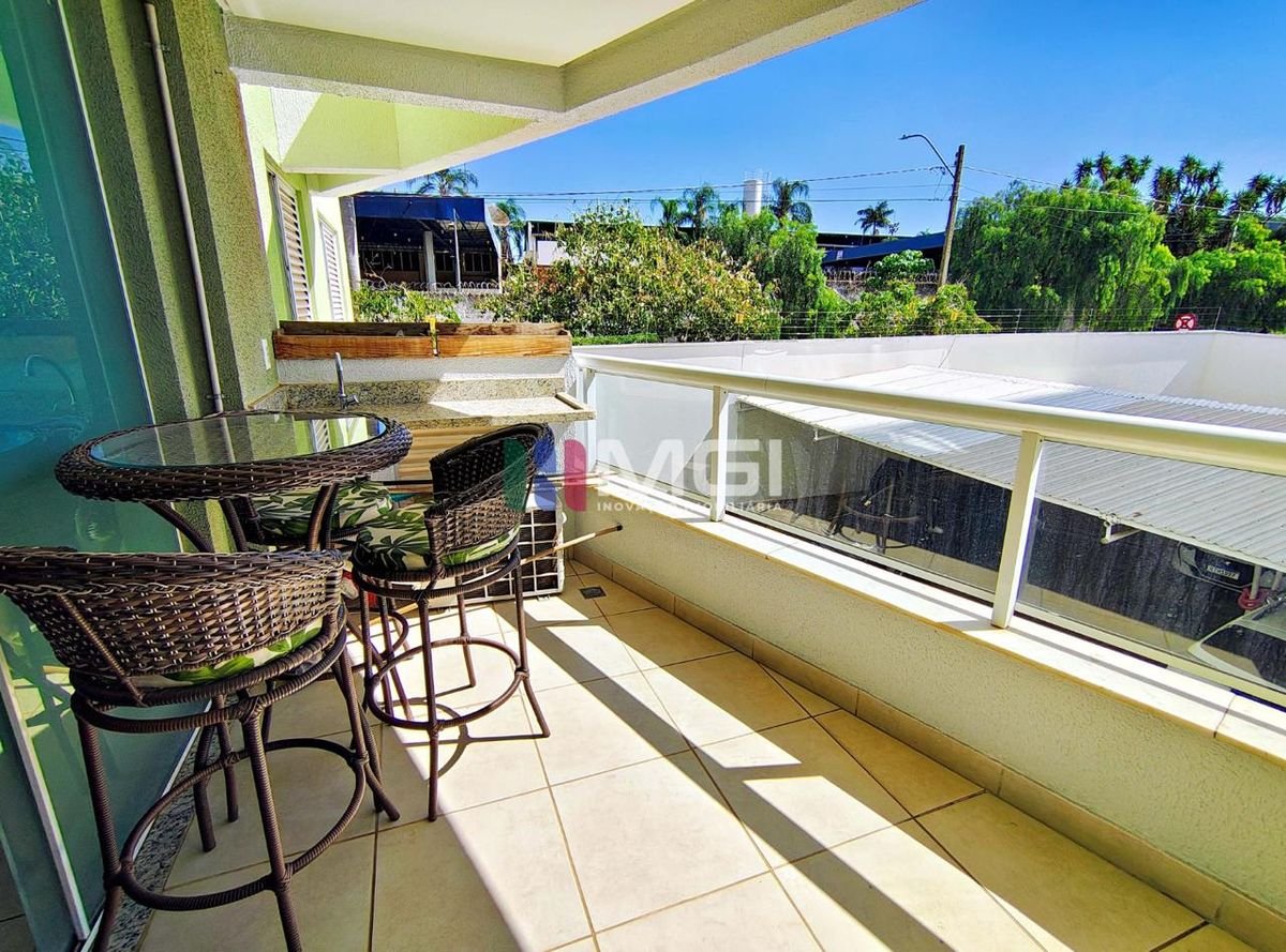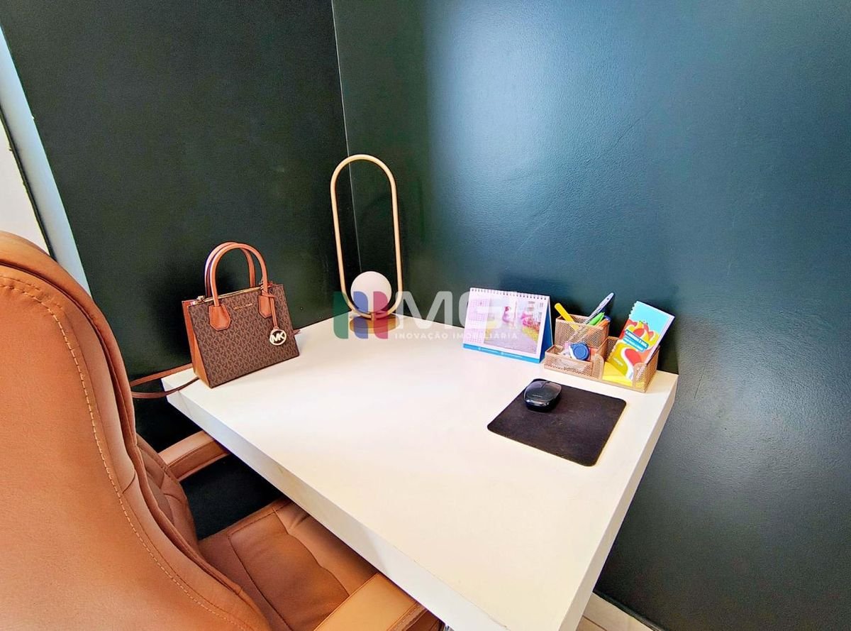 A sala de TV, com ar-condicionado, é integrada à varanda, que possui pia, armários planejados e espaço para churrasqueira elétrica.