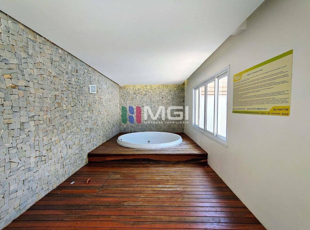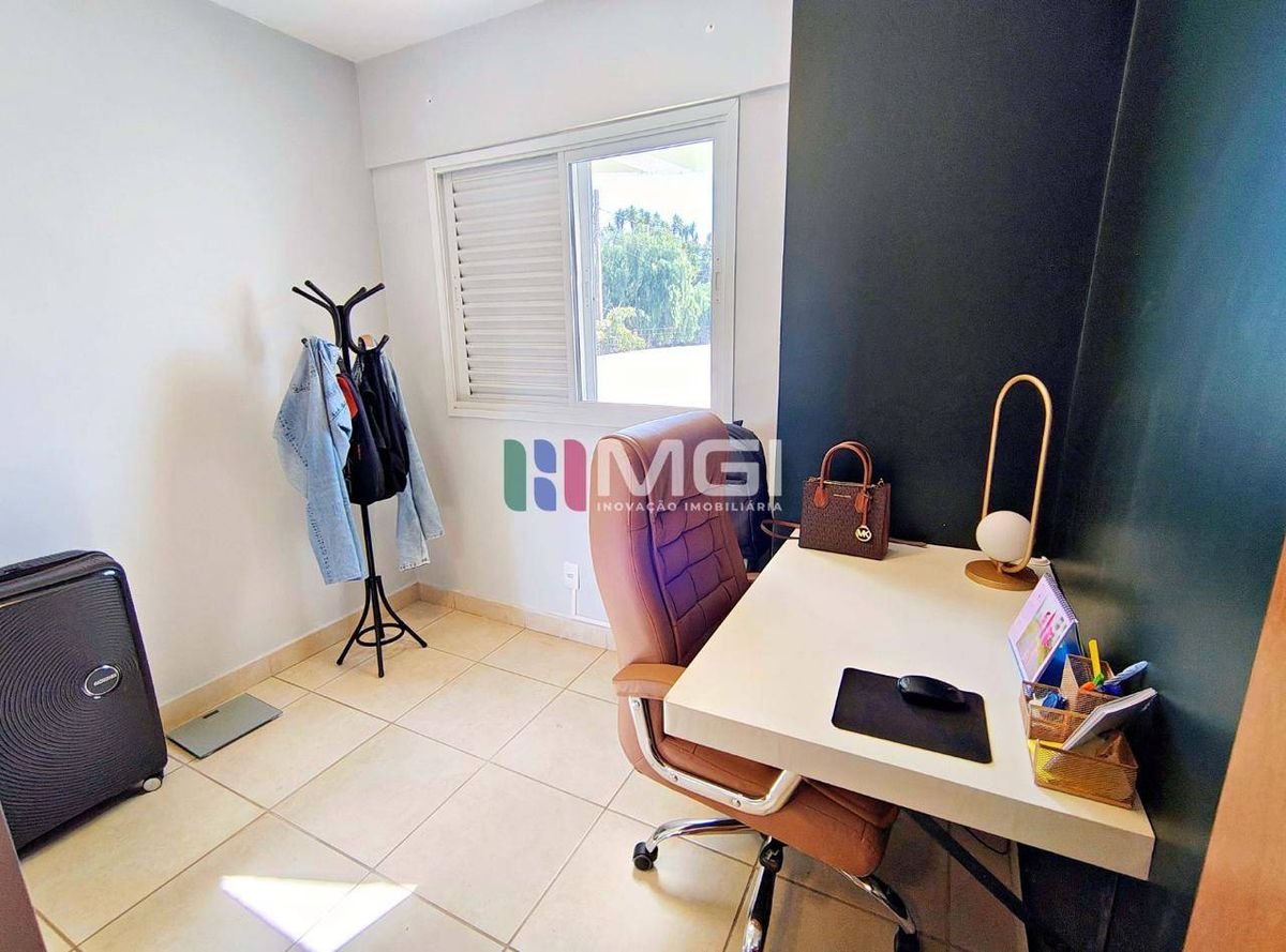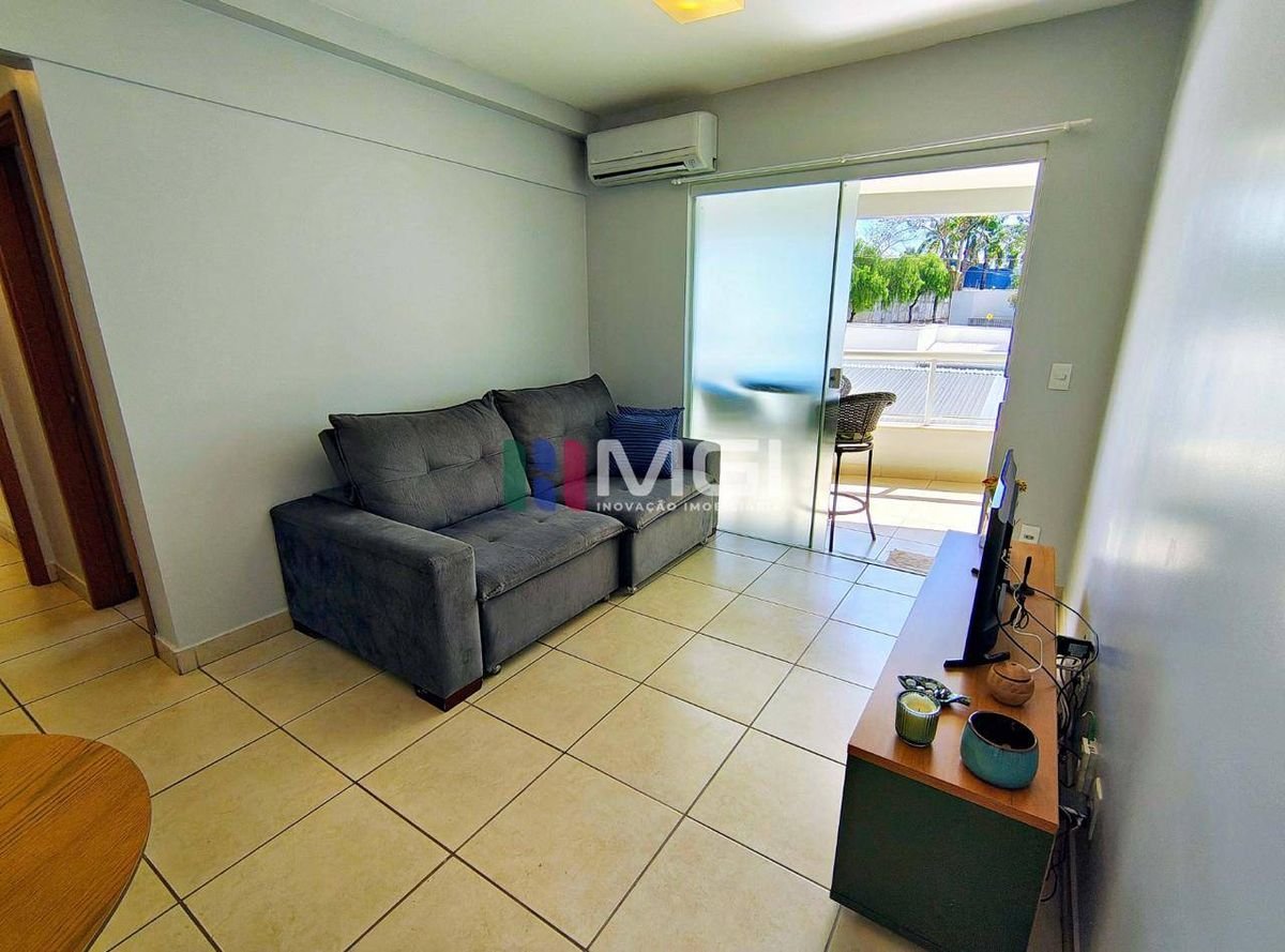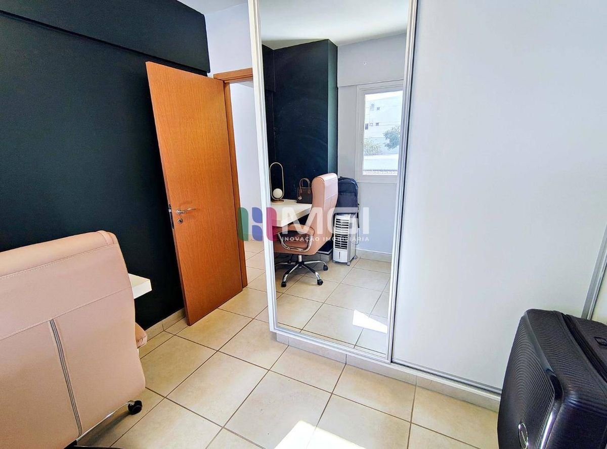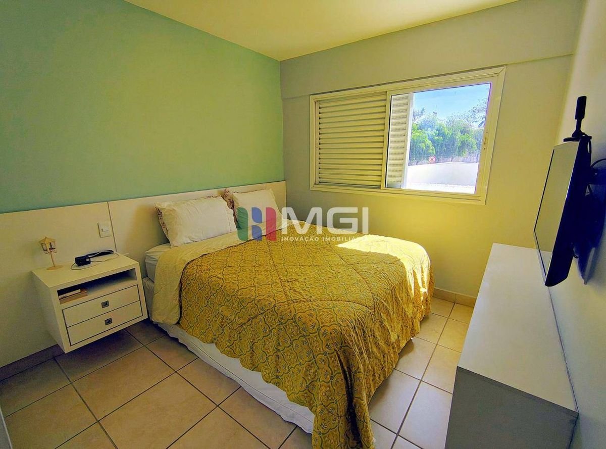 A sala de TV, com ar-condicionado, é integrada à varanda, que possui pia, armários planejados e espaço para churrasqueira elétrica.