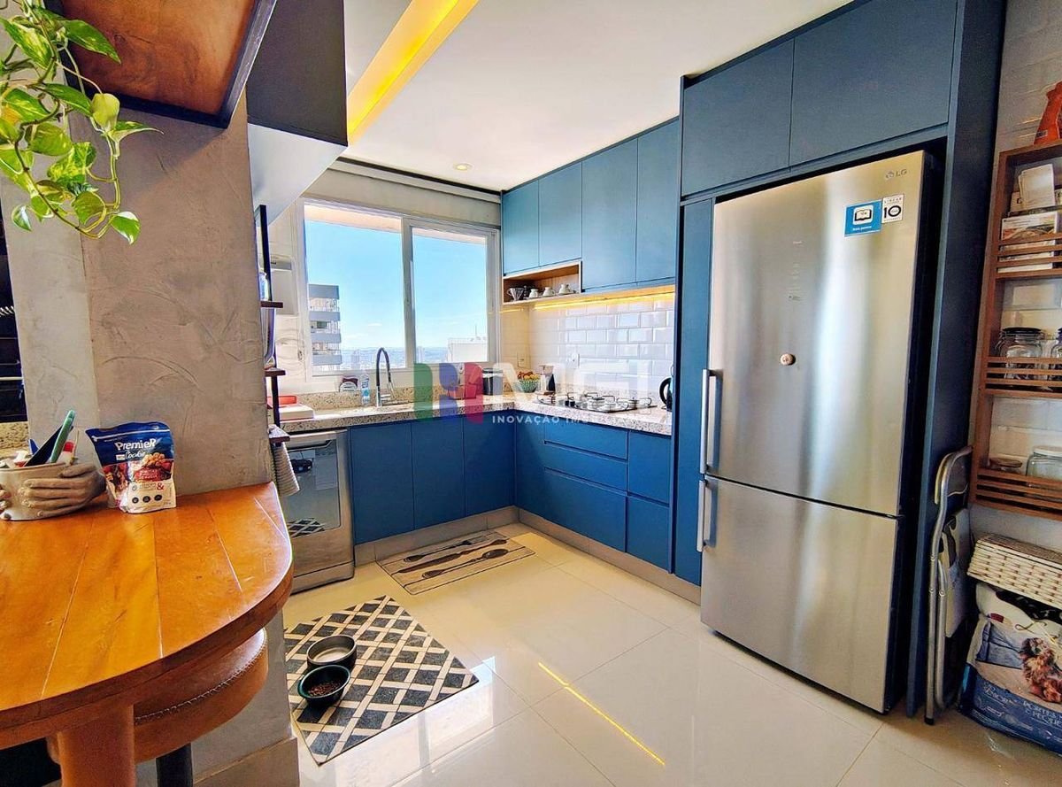 A cozinha americana é repleta de armários em tons de azul, revestimento branco Eliana, cooktop e torre quente Tramontina de última geração, a