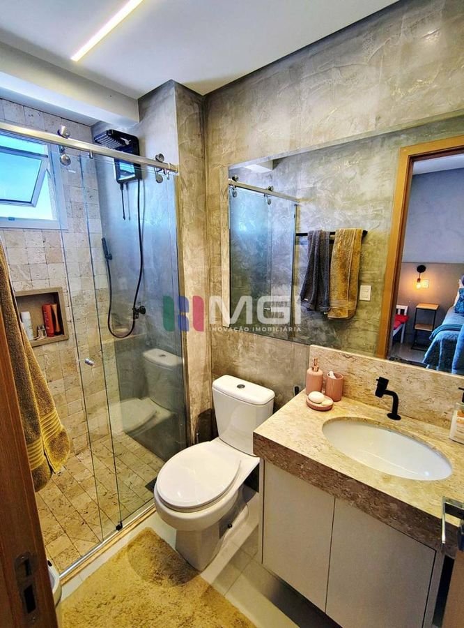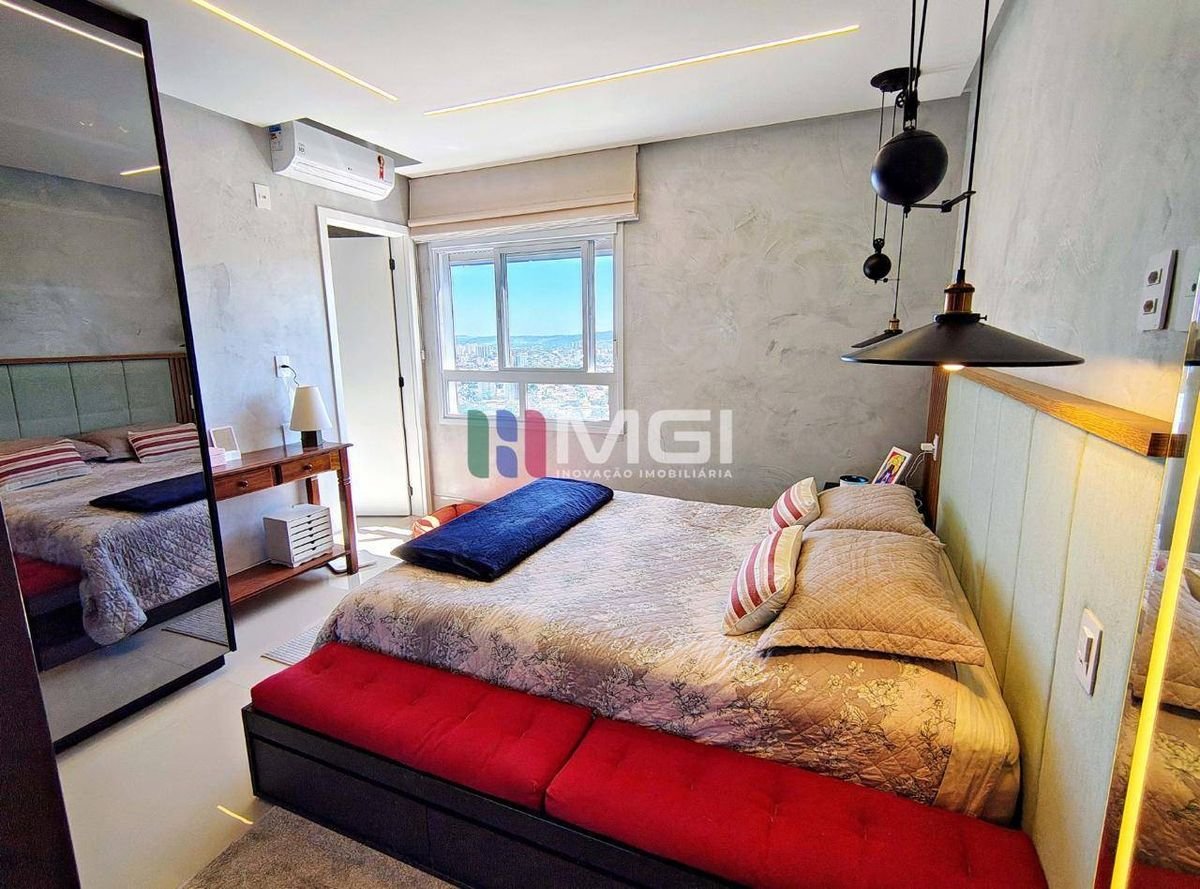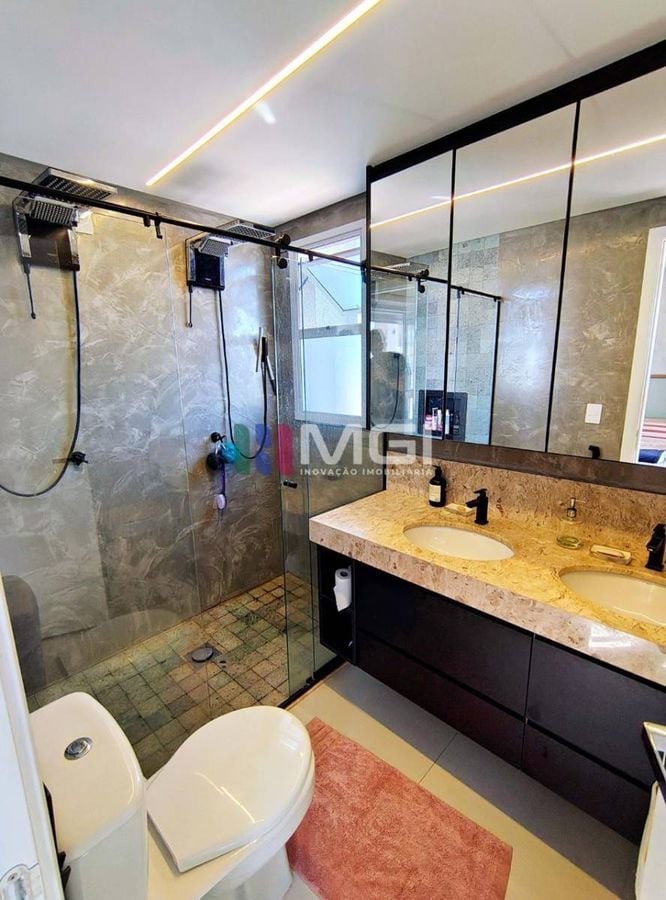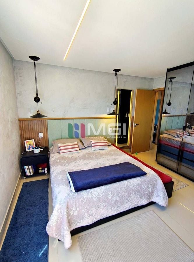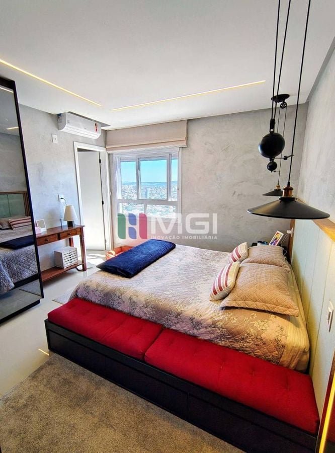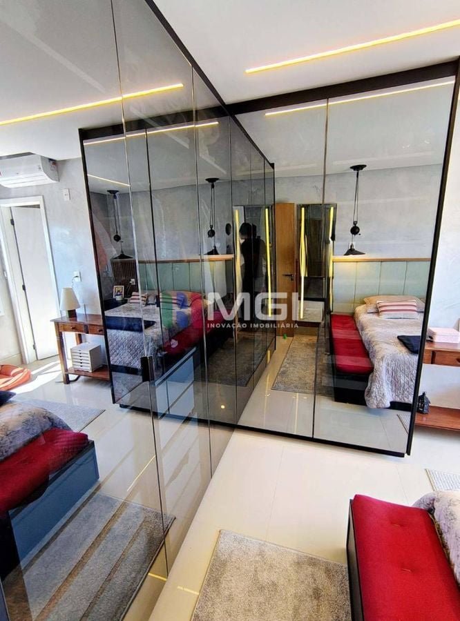 O apartamento conta com três suítes, todas com ar-condicionado, sendo a suíte master um verdadeiro refúgio: armários espelhados,