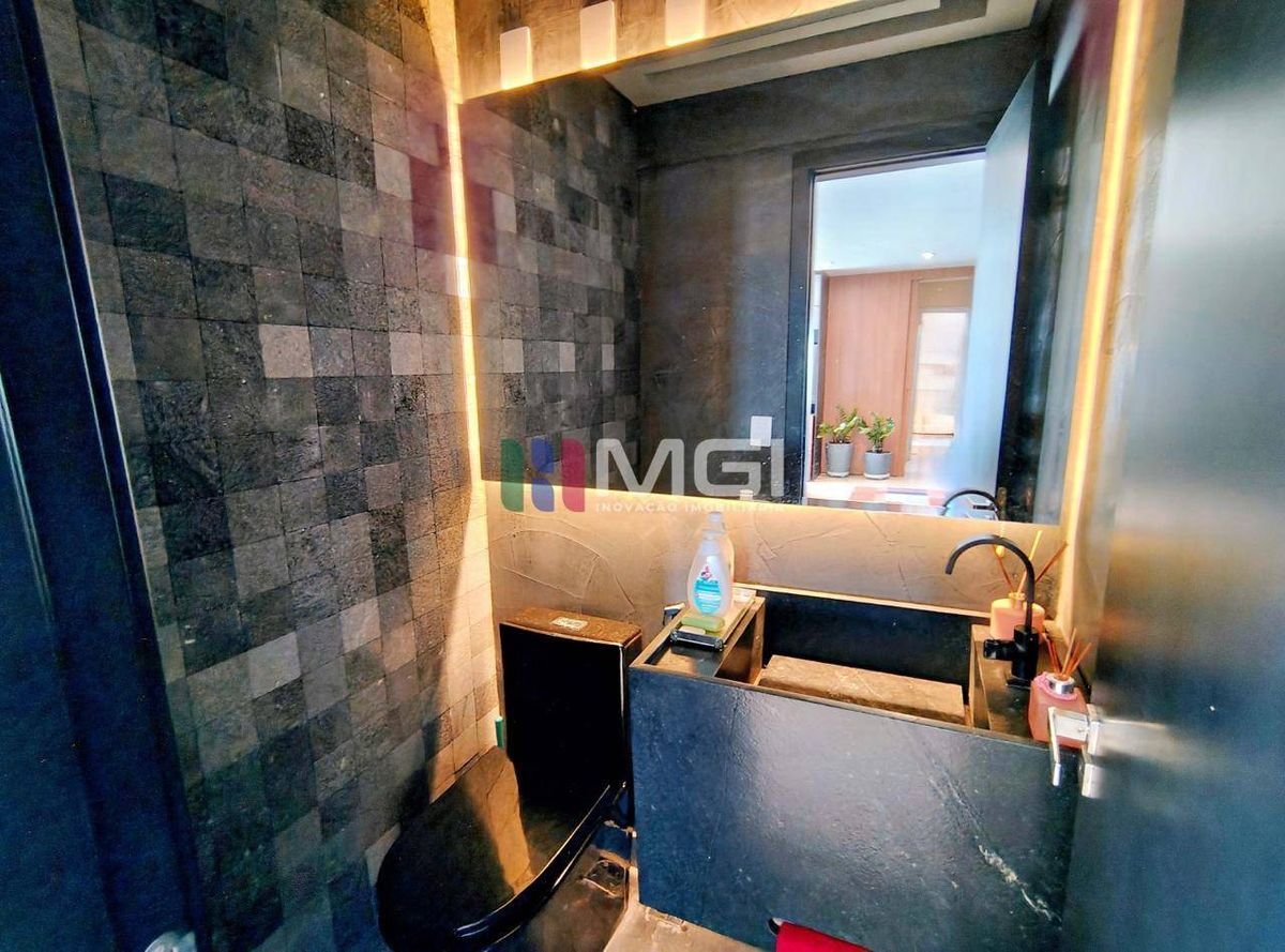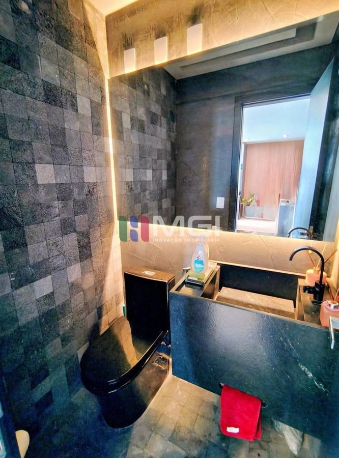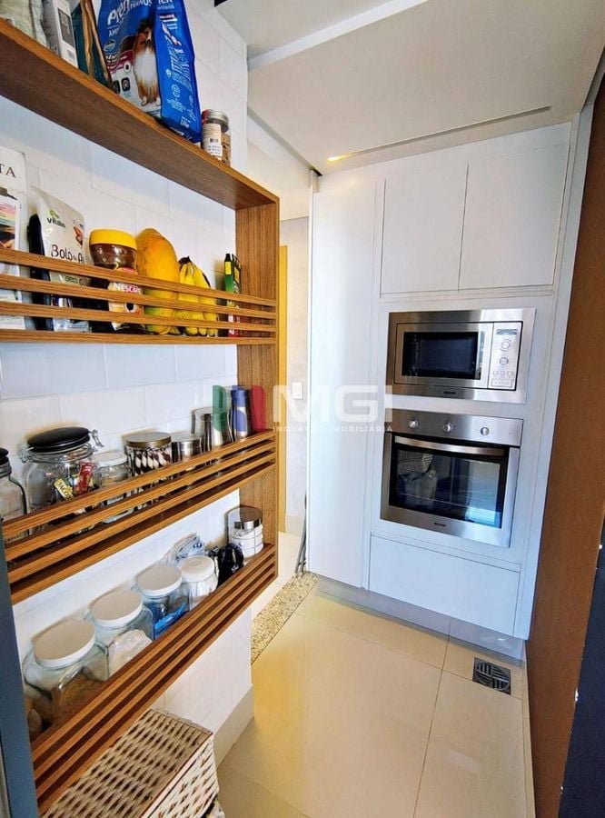 O apartamento tem ainda uma lavanderia com armários pretos e pia em granito preto Gabriel, além de duas vagas de garagem paralelas.