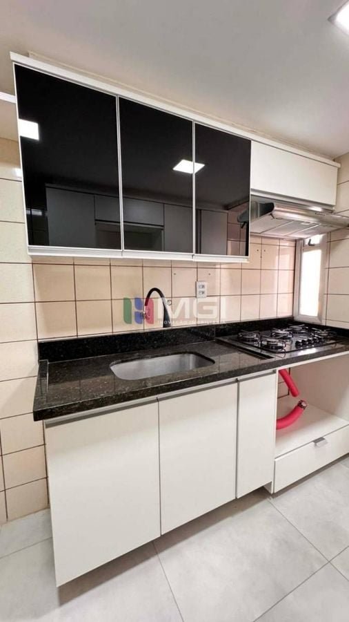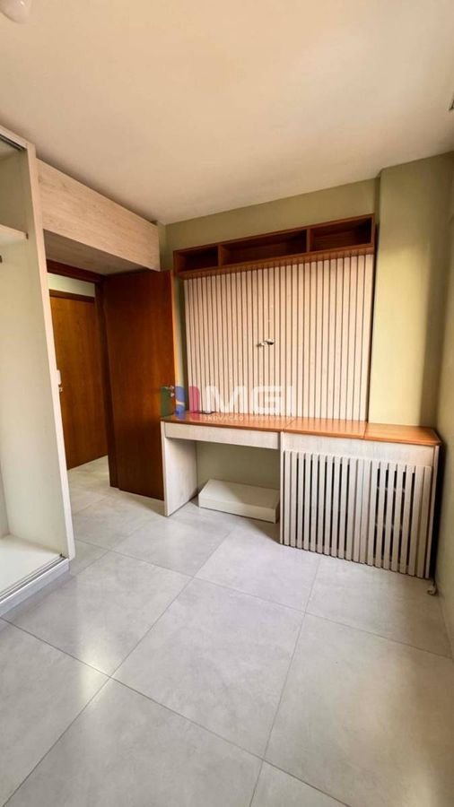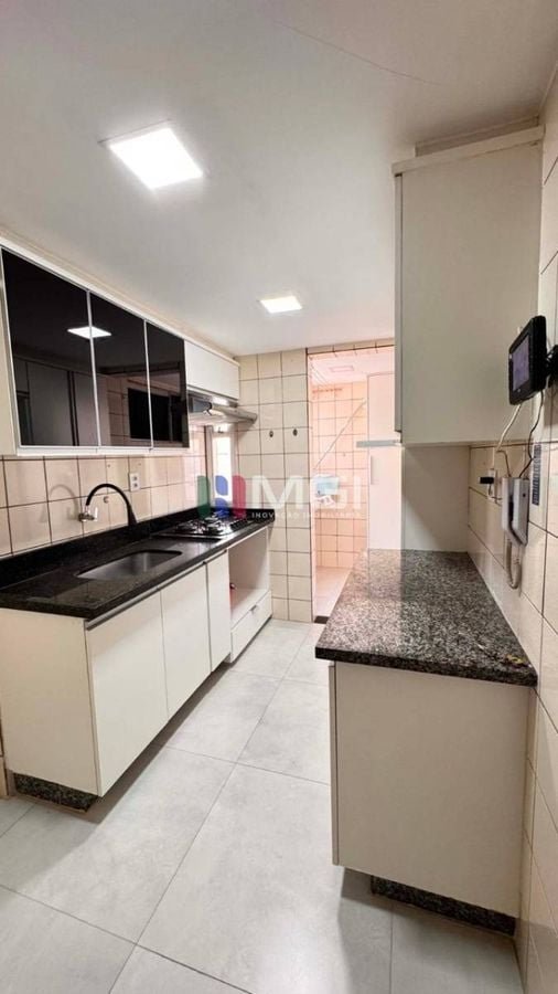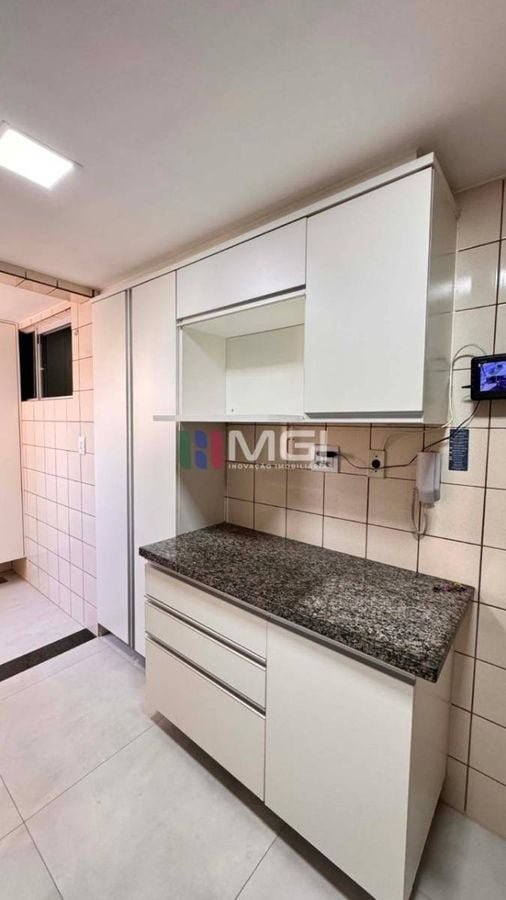 São 3 quartos, sendo 1 suíte, além de banheiro social, cozinha com bancada em pedra verde Ubatuba e armários planejados.