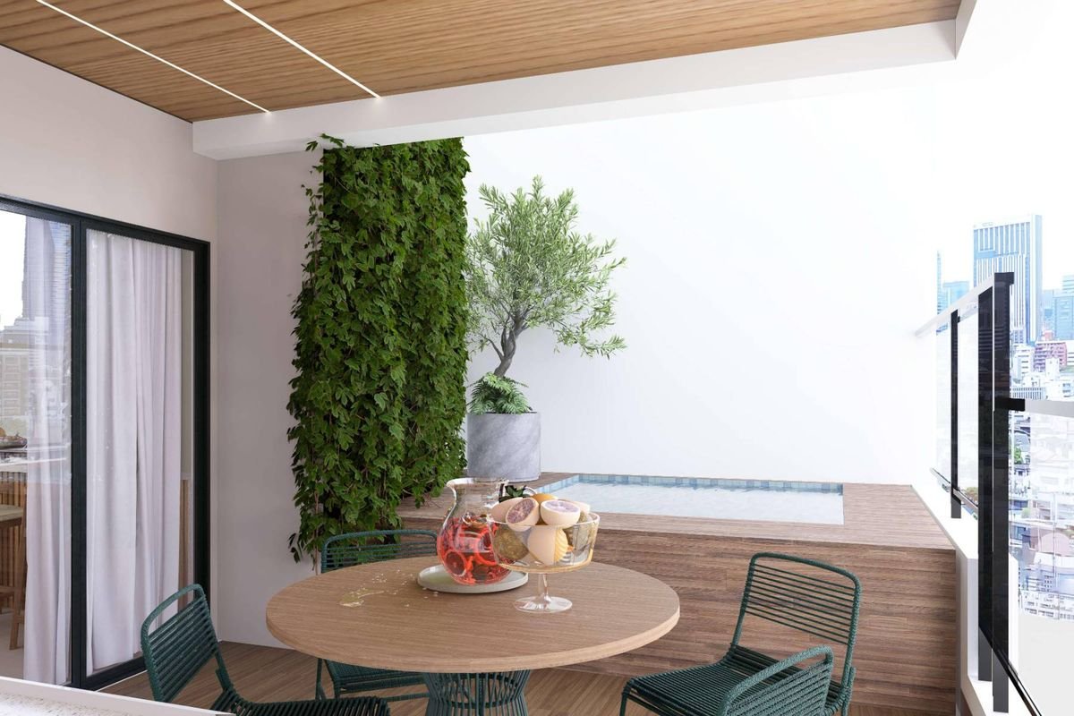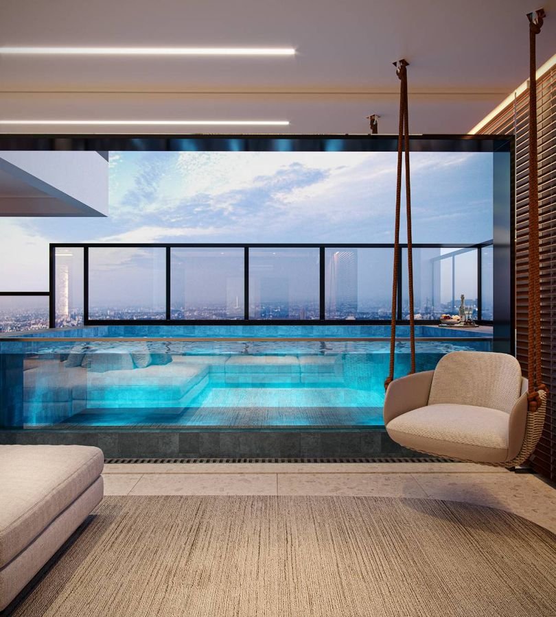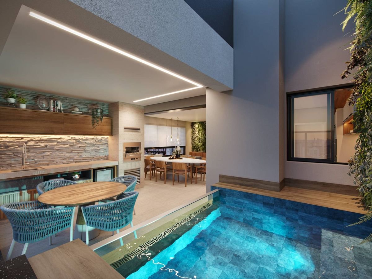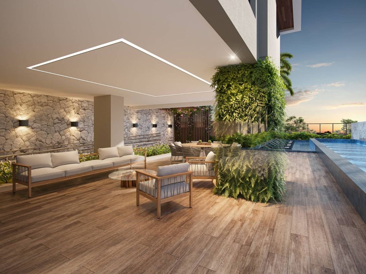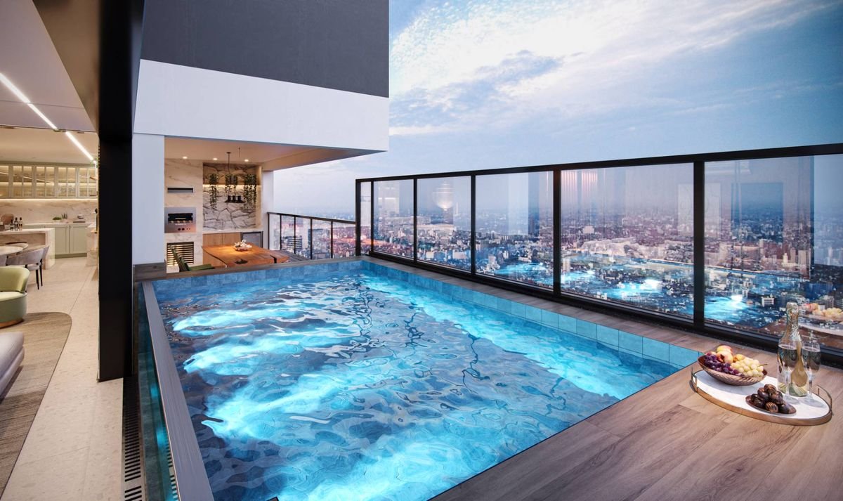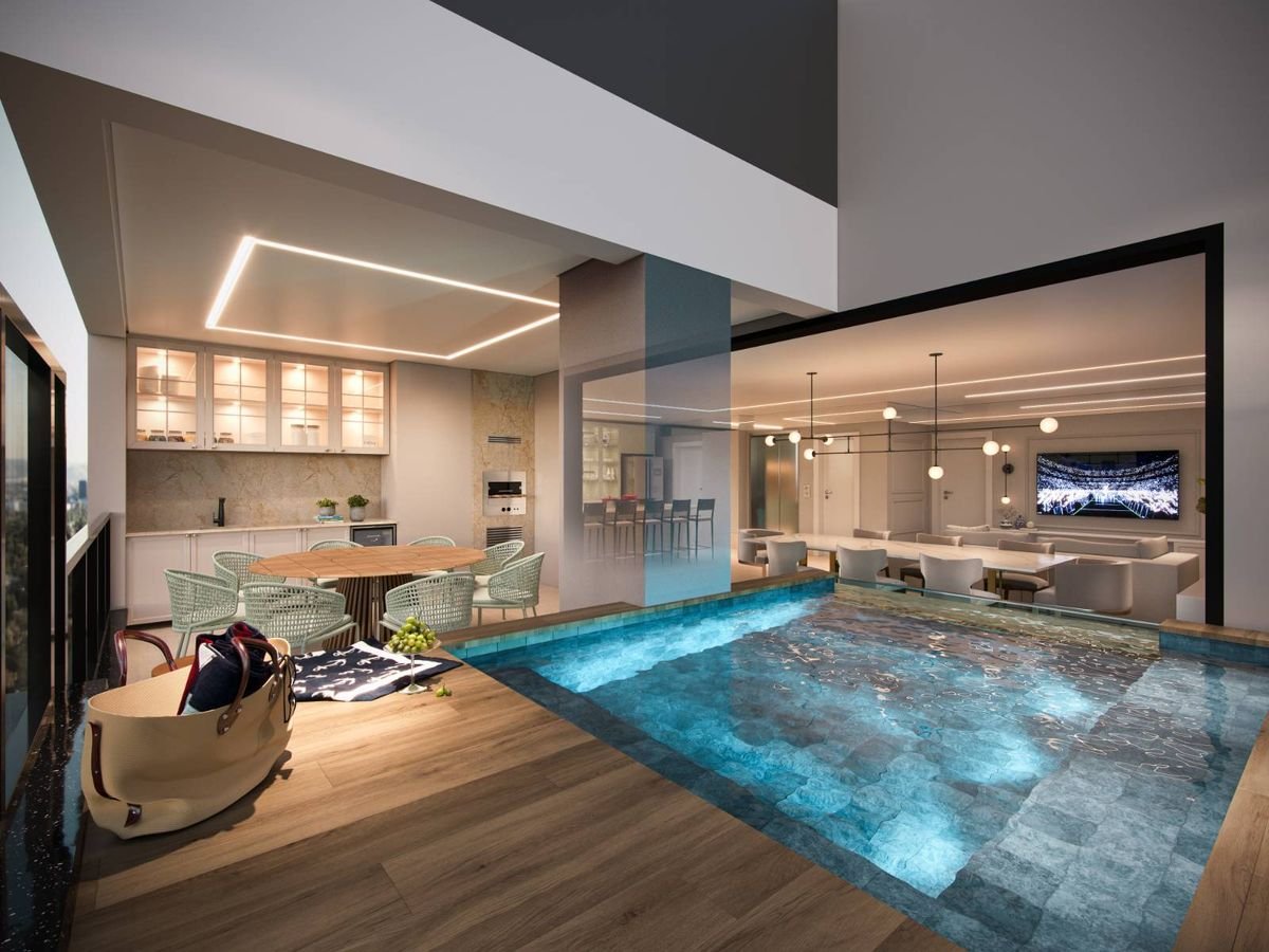 aproximadamente 356 m². Os apartamentos possuem living integrado à varanda, muitas vezes com piscina privativa, e contam com a entrada do sol da manhã, proporcionando iluminação