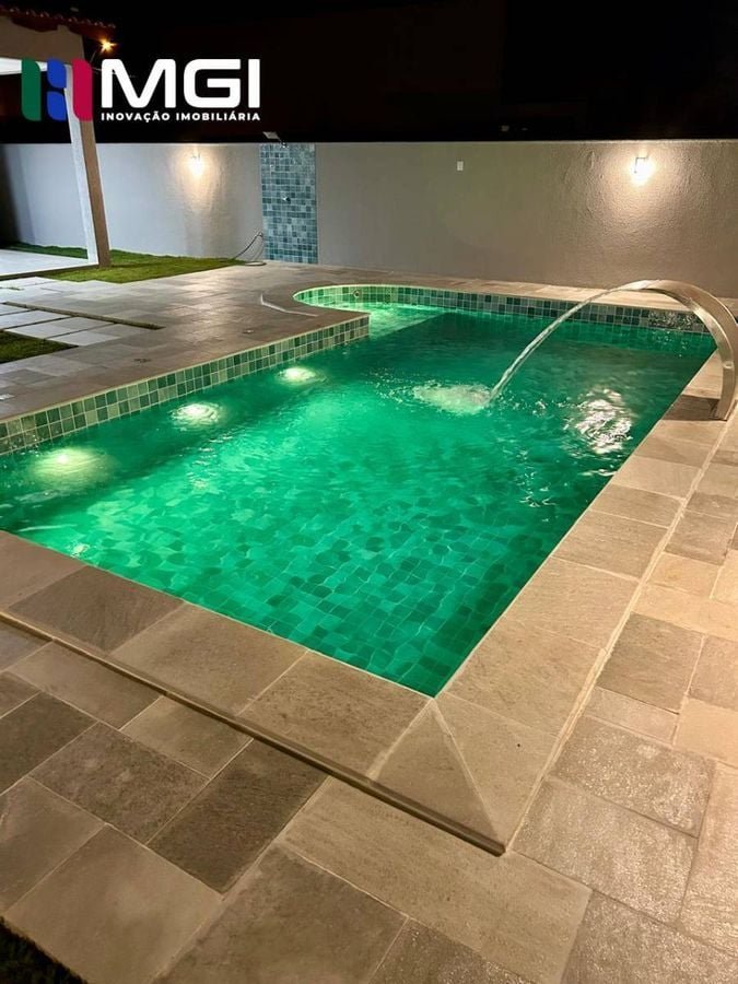 A piscina de 8×3 metros conta com cascata, hidromassagem, iluminação em LED para o período noturno e está preparada para aquecimento solar.