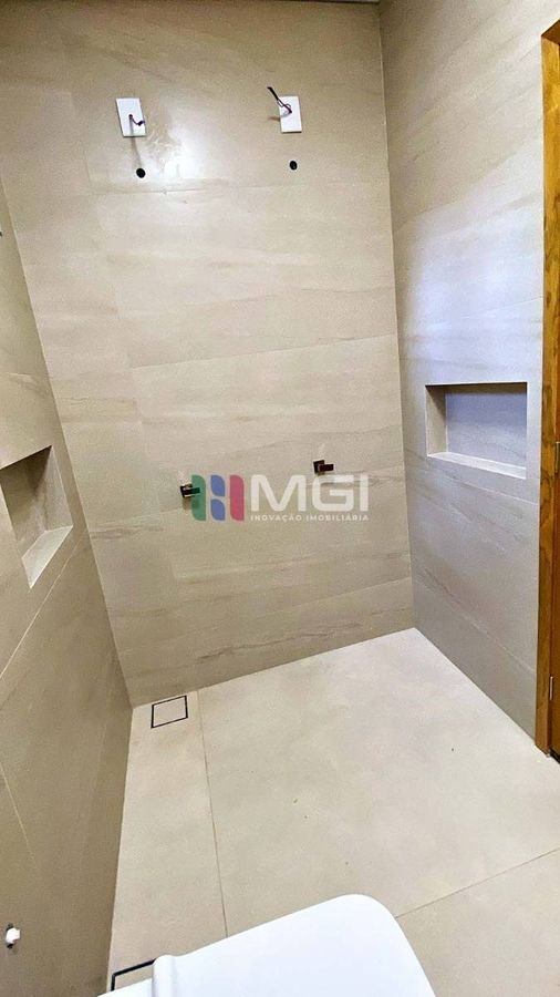 A casa tem 3 quartos, sendo uma suíte master com closet e banheiro espaçoso, além de banheiro social e lavabo.