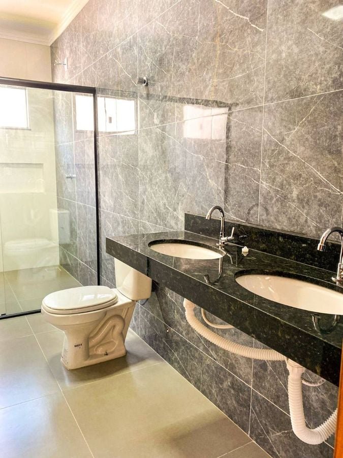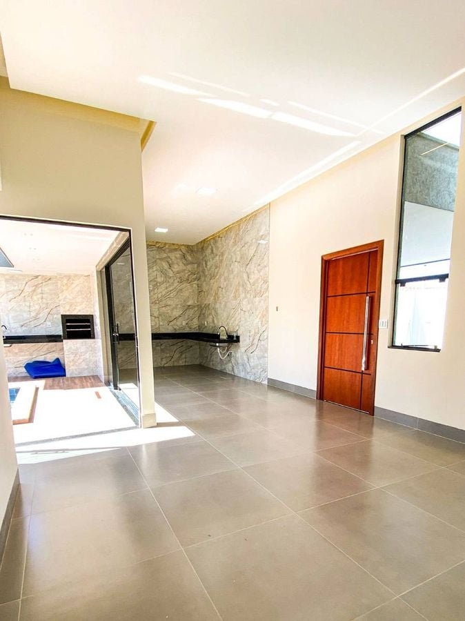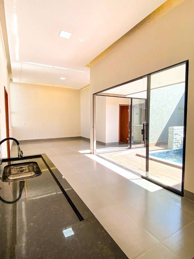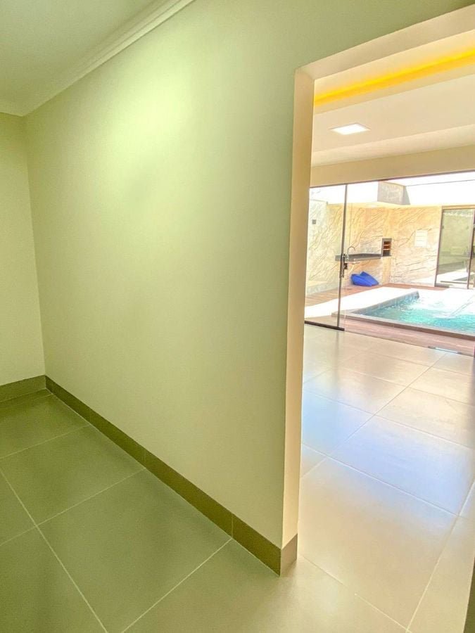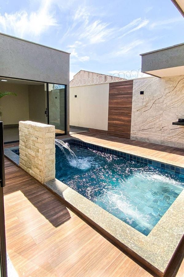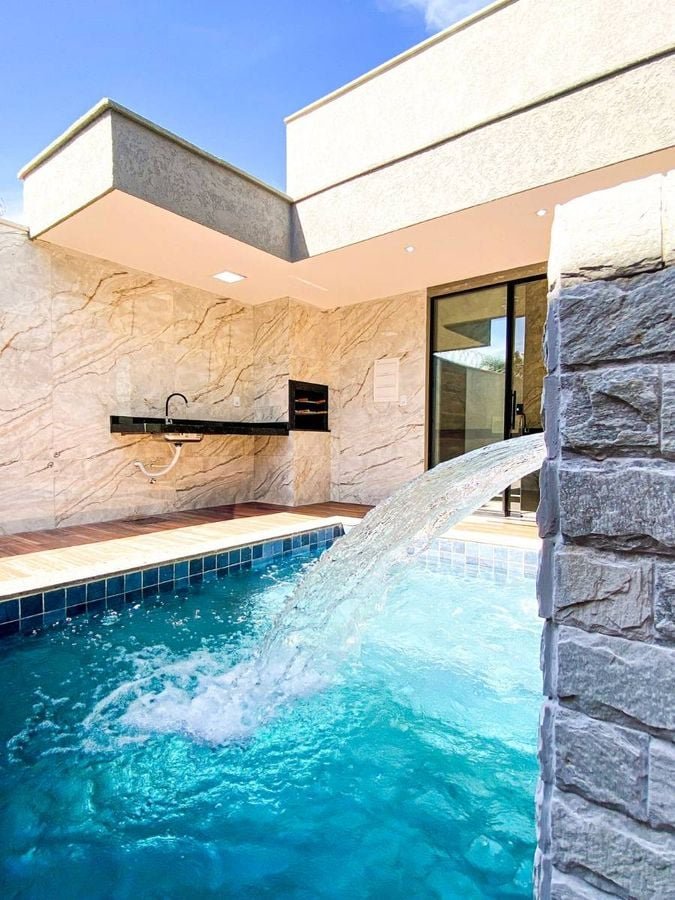 A varanda gourmet com churrasqueira a carvão é ideal para momentos de lazer, enquanto a piscina conta com aquecimento solar, hidromassagem, iluminação em LED e cascata — um verdadeiro convite ao relaxamento.