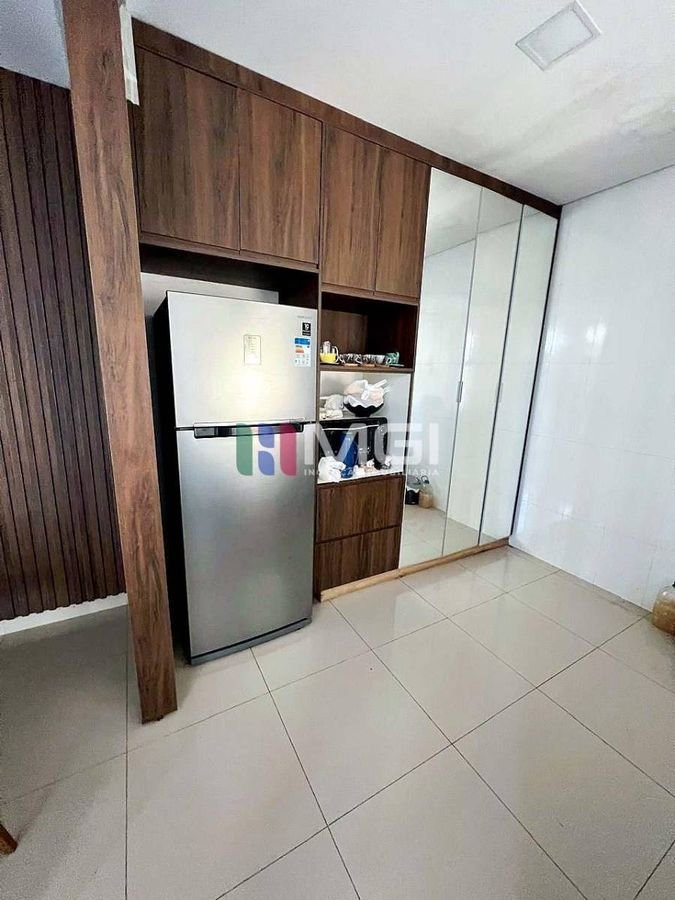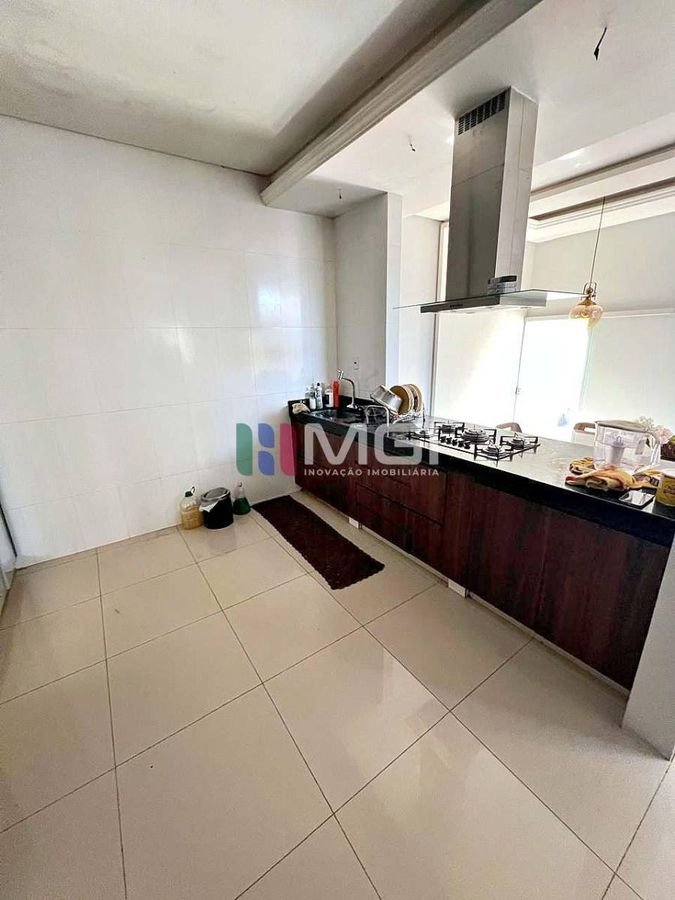 A cozinha ampla conta com bancada em mármore e integra-se à área gourmet, equipada com churrasqueira, pia e bancada, perfeita para momentos de lazer e convivência. Há também uma área de lavanderia prática e bem ventilada.
