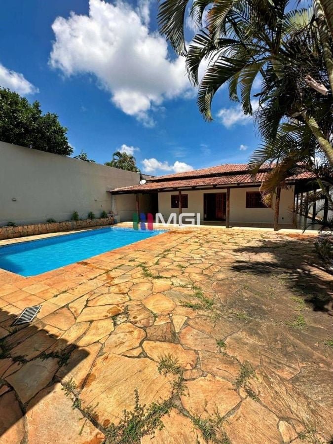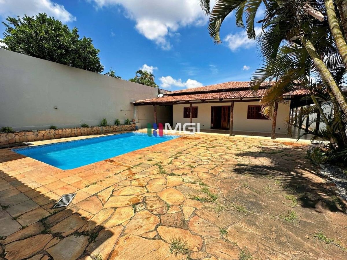 Área externa com espaço gourmet em pedra Pirenópolis, churrasqueira, piscina 7x4m e jardim de inverno.