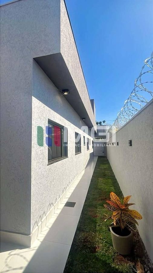 O corredor lateral é amplo, revestido e iluminado, e a calçada da entrada foi feita com acabamento em Fugie.