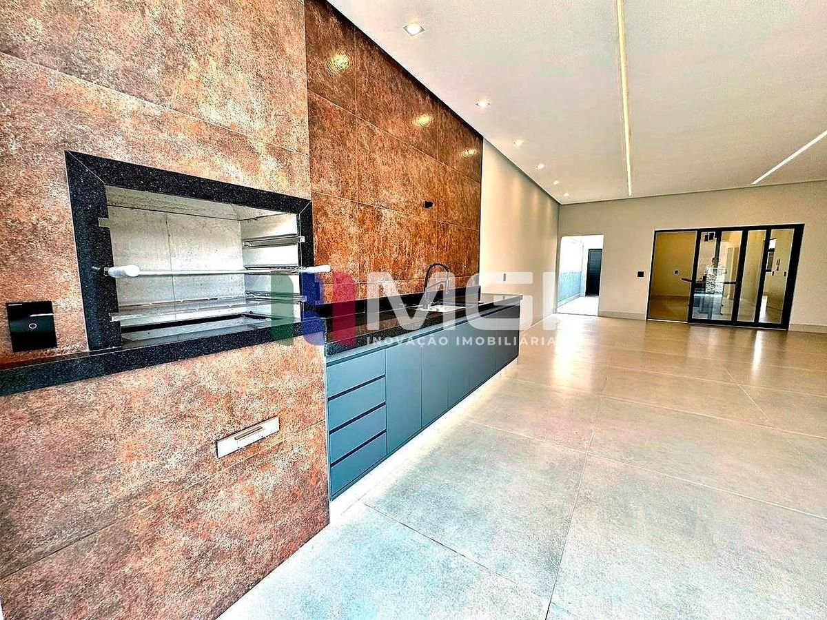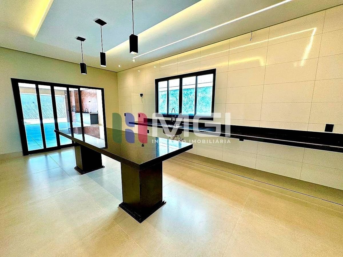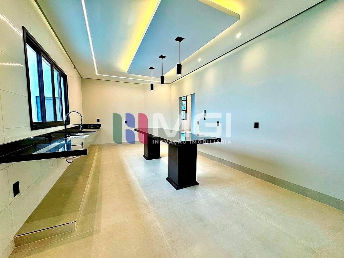 Cozinha gourmet com ilha em granito e espaço gourmet integrado com churrasqueira, pia, bancada e banheiro privativo.