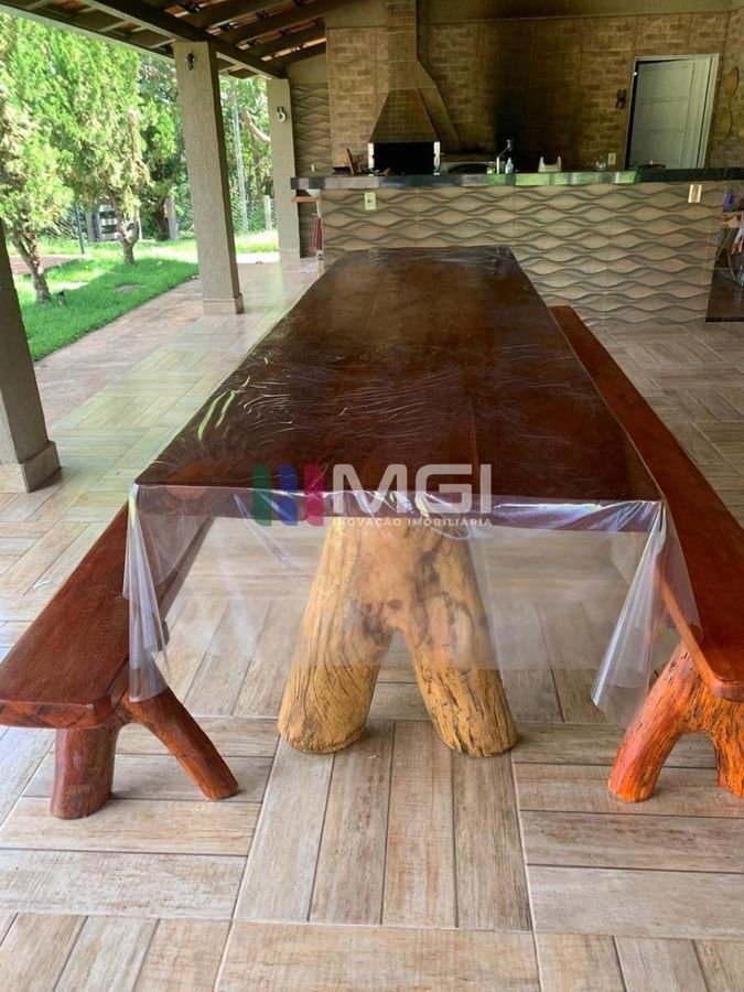 A casa principal conta com três quartos, sendo uma suíte equipada com ar-condicionado, além de cozinha interna e externa, equipada com fogão caipira, forno a lenha e churrasqueira.