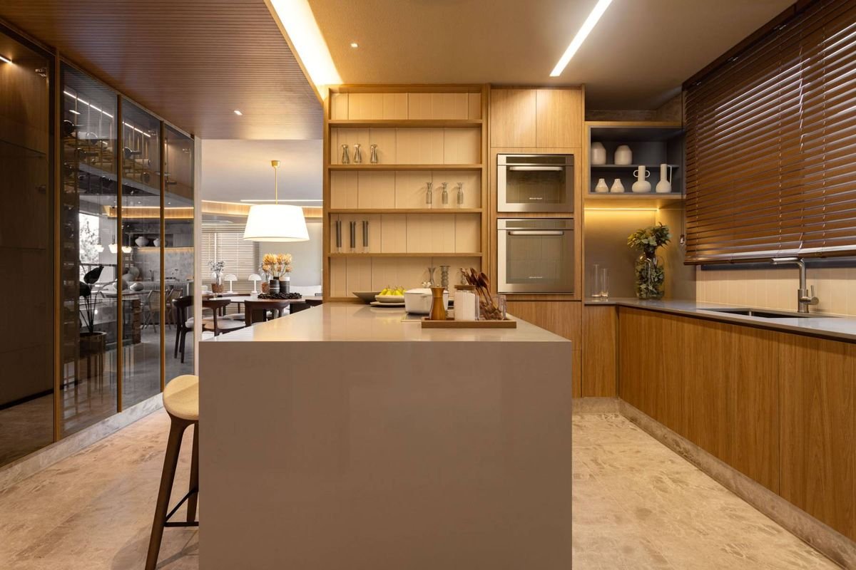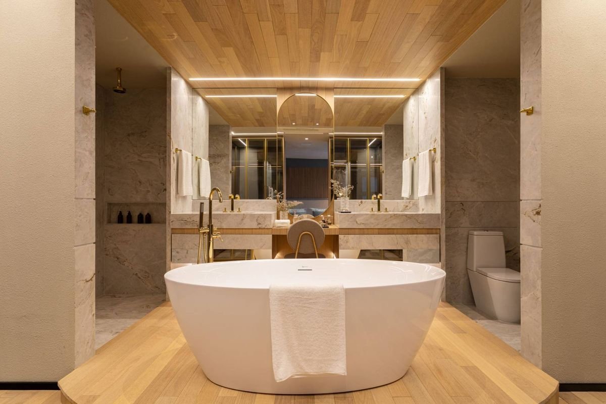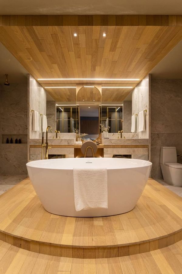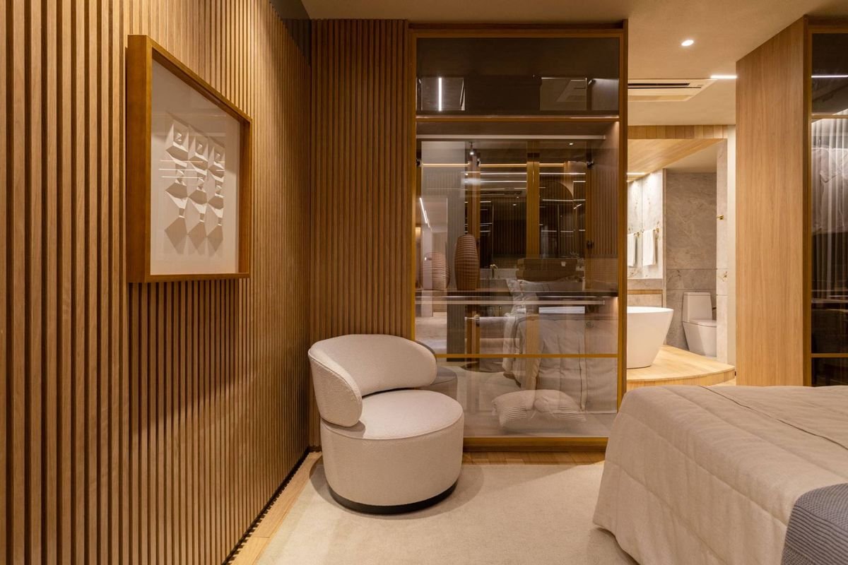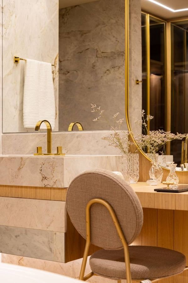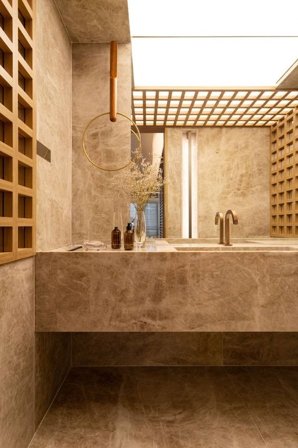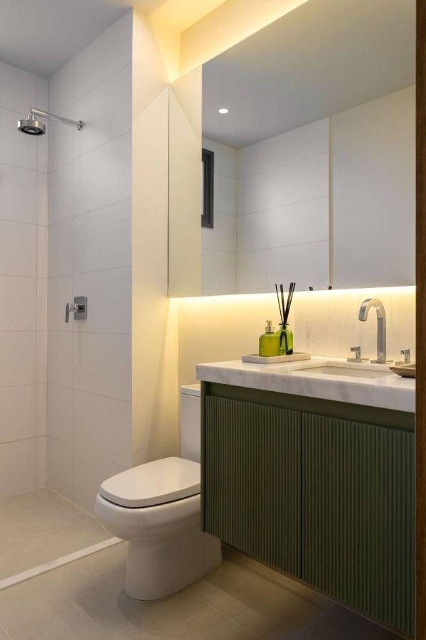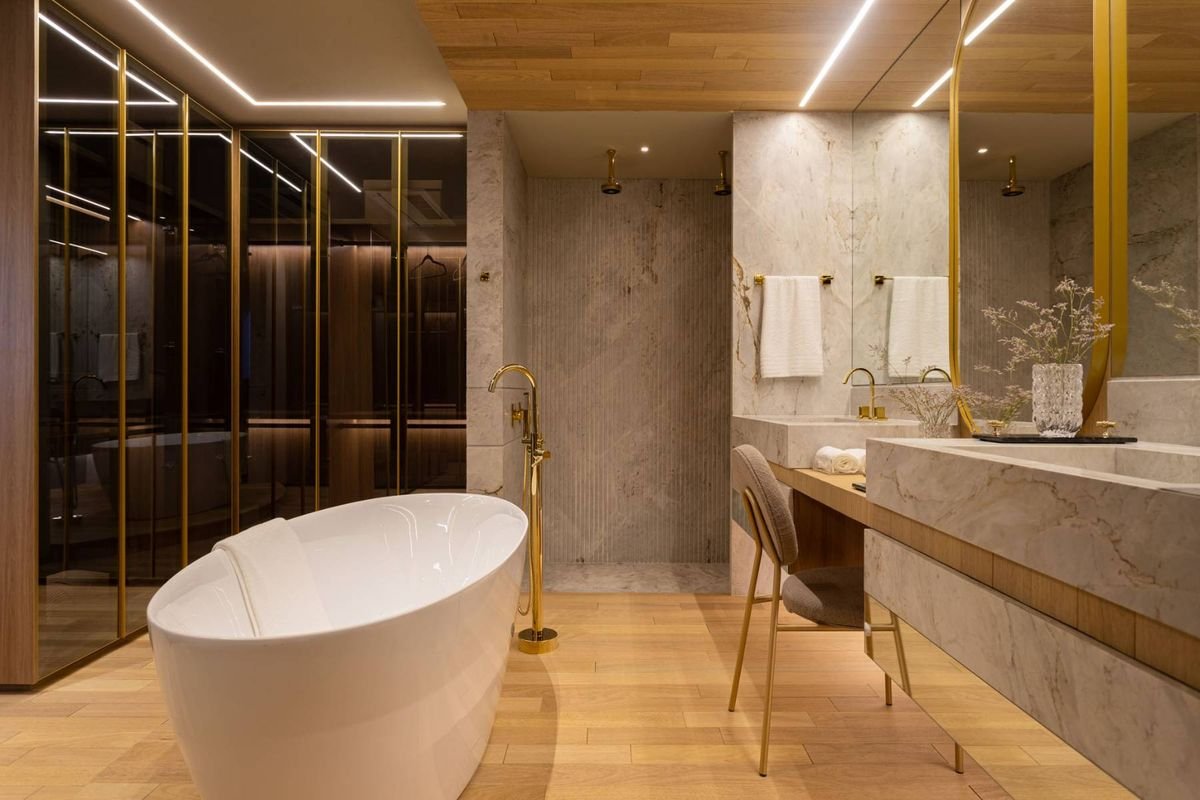 Os apartamentos têm 3 ou 4 banheiros principais, conforme o número de suítes, além de 1 lavabo social e banheiro de serviço, totalizando de 5 a 6 banheiros por unidade, dependendo