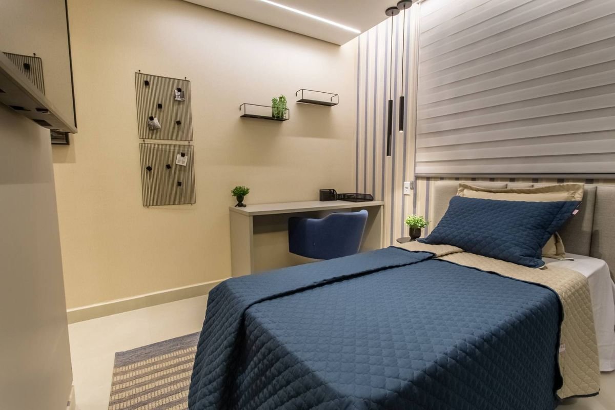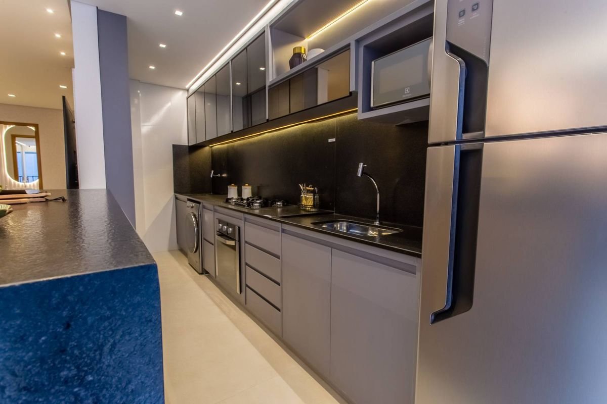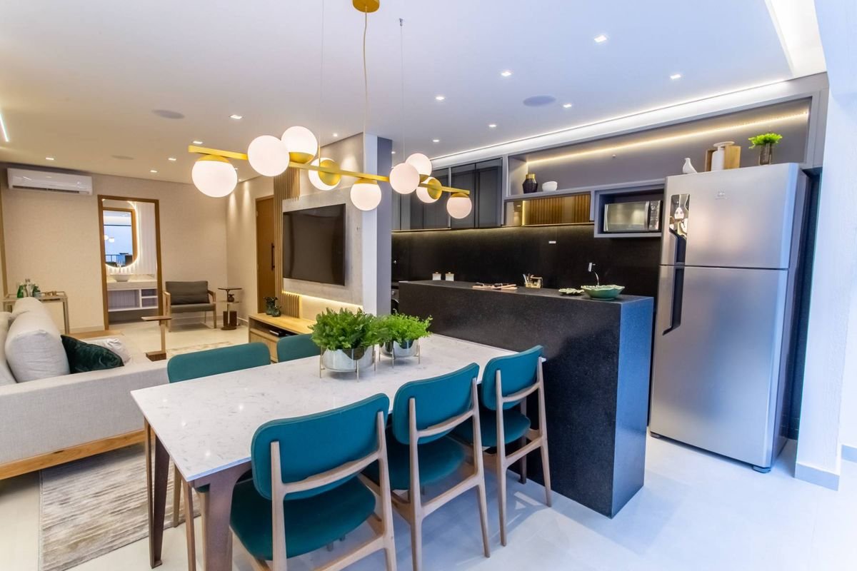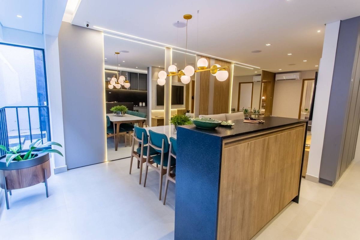 Todos os apartamentos possuem varanda, sala de estar e jantar integradas, cozinha moderna e acabamentos de alto padrão, incluindo fechadura digital, forro rebaixado em gesso, bancadas em granito, tomadas USB nas suítes e preparação para ar-condicionado split.