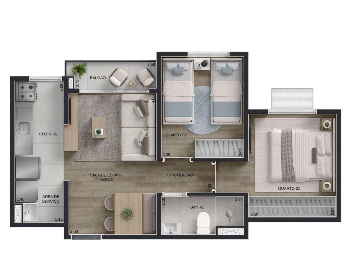 O empreendimento oferece apartamentos de 2 quartos, com metragens entre 42 e 44 m², ideais para quem busca seu primeiro imóvel ou um investimento com ótimo custo-benefício.