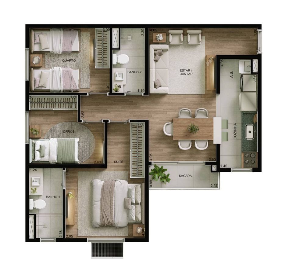 O Pitangueira contará com apartamentos de 2 e 3 quartos, com plantas funcionais e bem distribuídas. As unidades terão entre 43 m² e 61 m² de área privativa, todas com