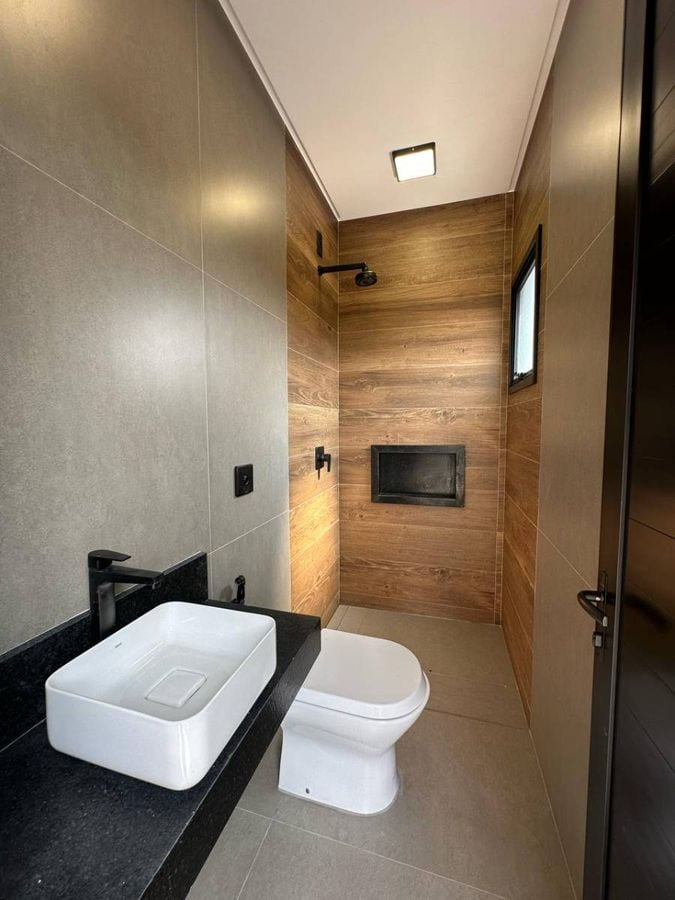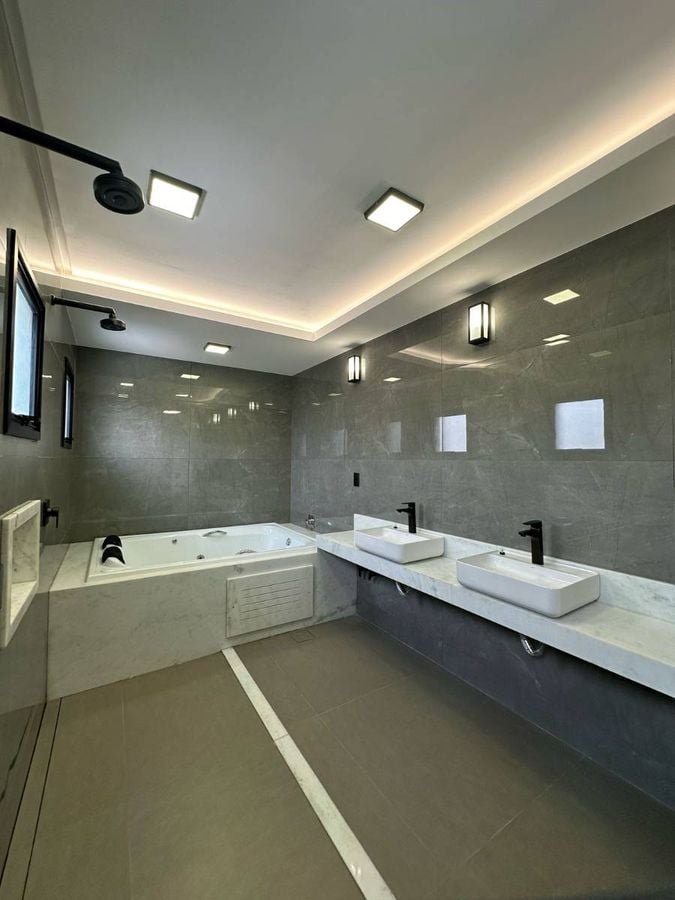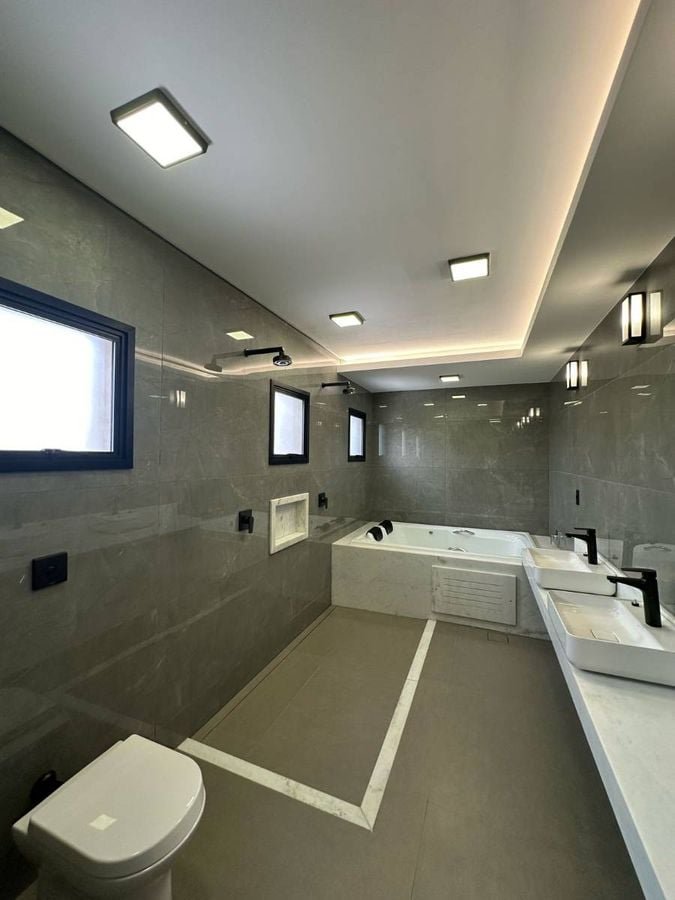 Acabamentos de alto padrão, porcelanato, metais Deca, iluminação planejada e paisagismo integrado.